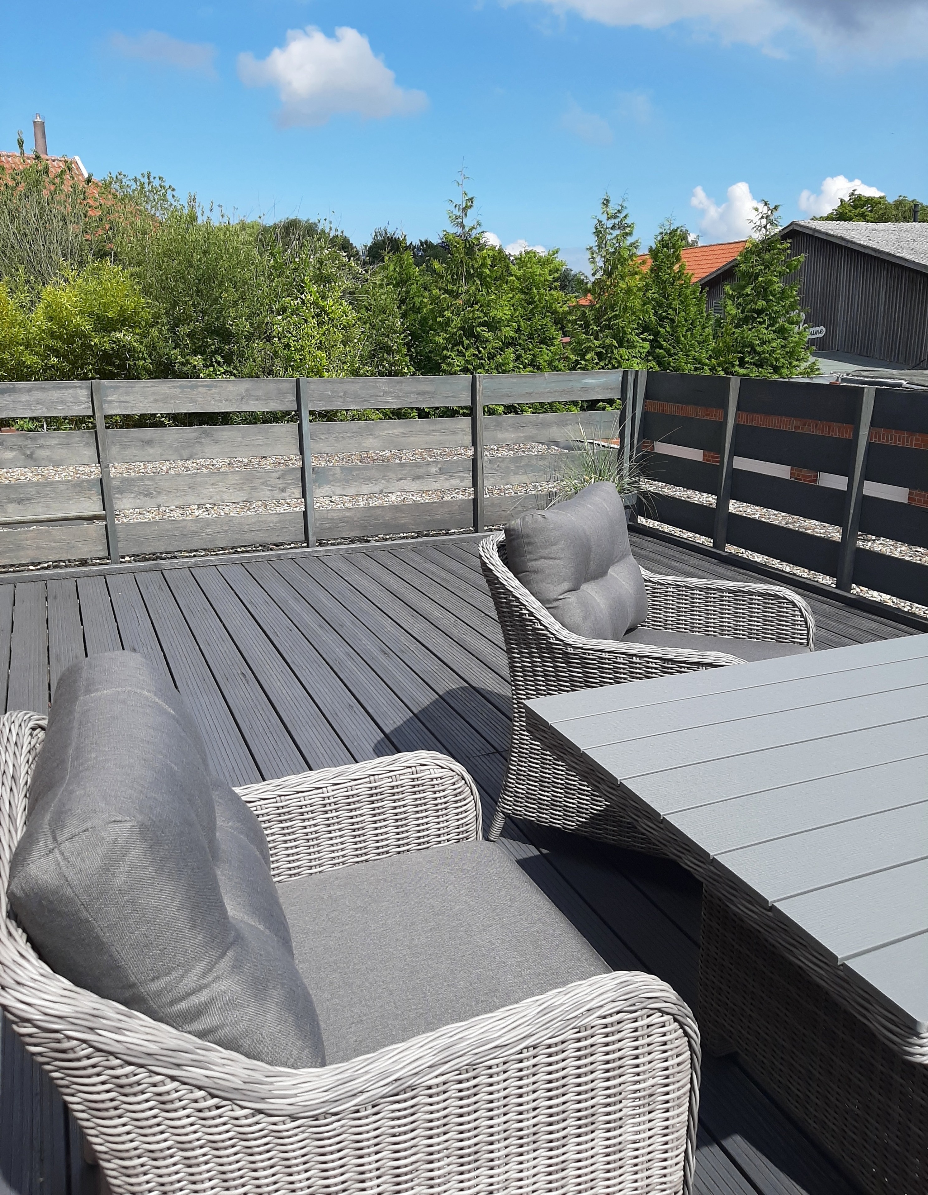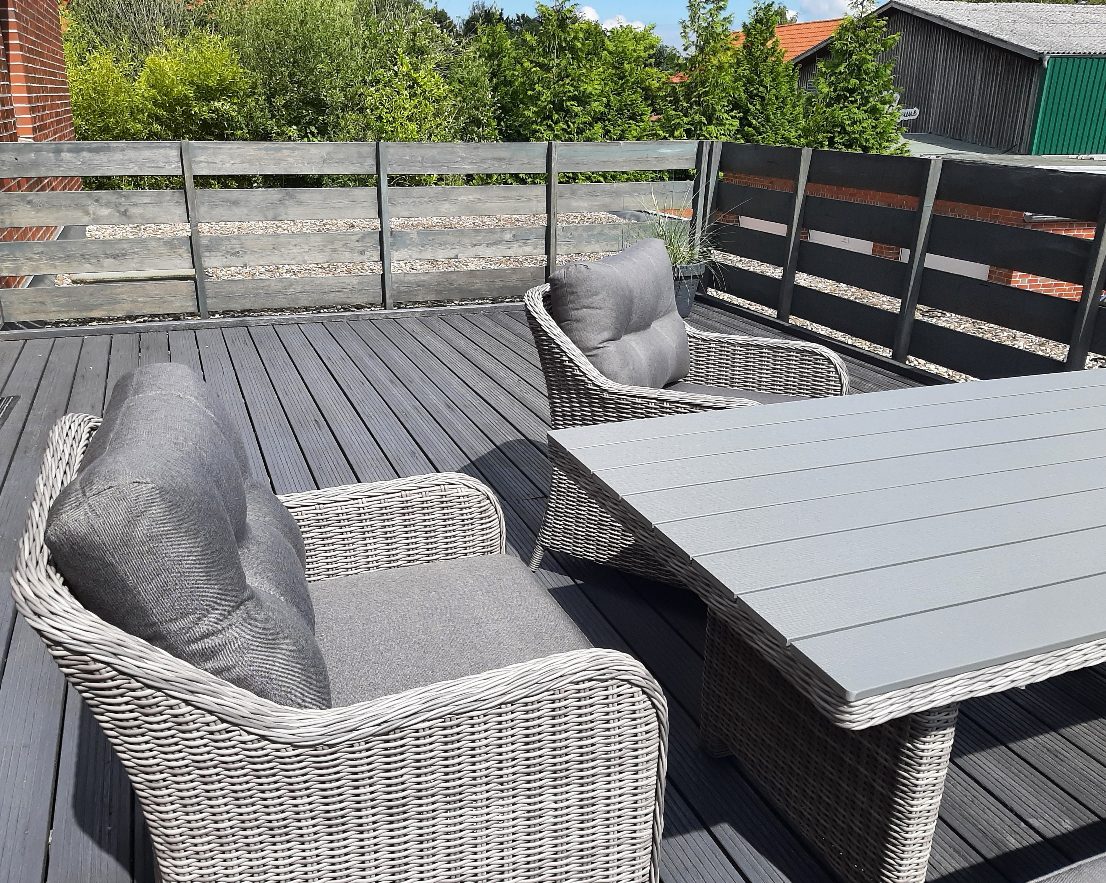 Ausgestattet mit einem modernen Loungeset und einem großzügigen Tisch, lädt die Terrasse zu entspannten Stunden im Freien ein. Der Sonnenschirm sorgt an sonnigen Tagen für angenehmen Schatten, während Sie hier in Ruhe ein Buch lesen oder den Tag mit der Familie genießen können. Ein wahres Highlight, das zum Entspannen und Verweilen einlädt.