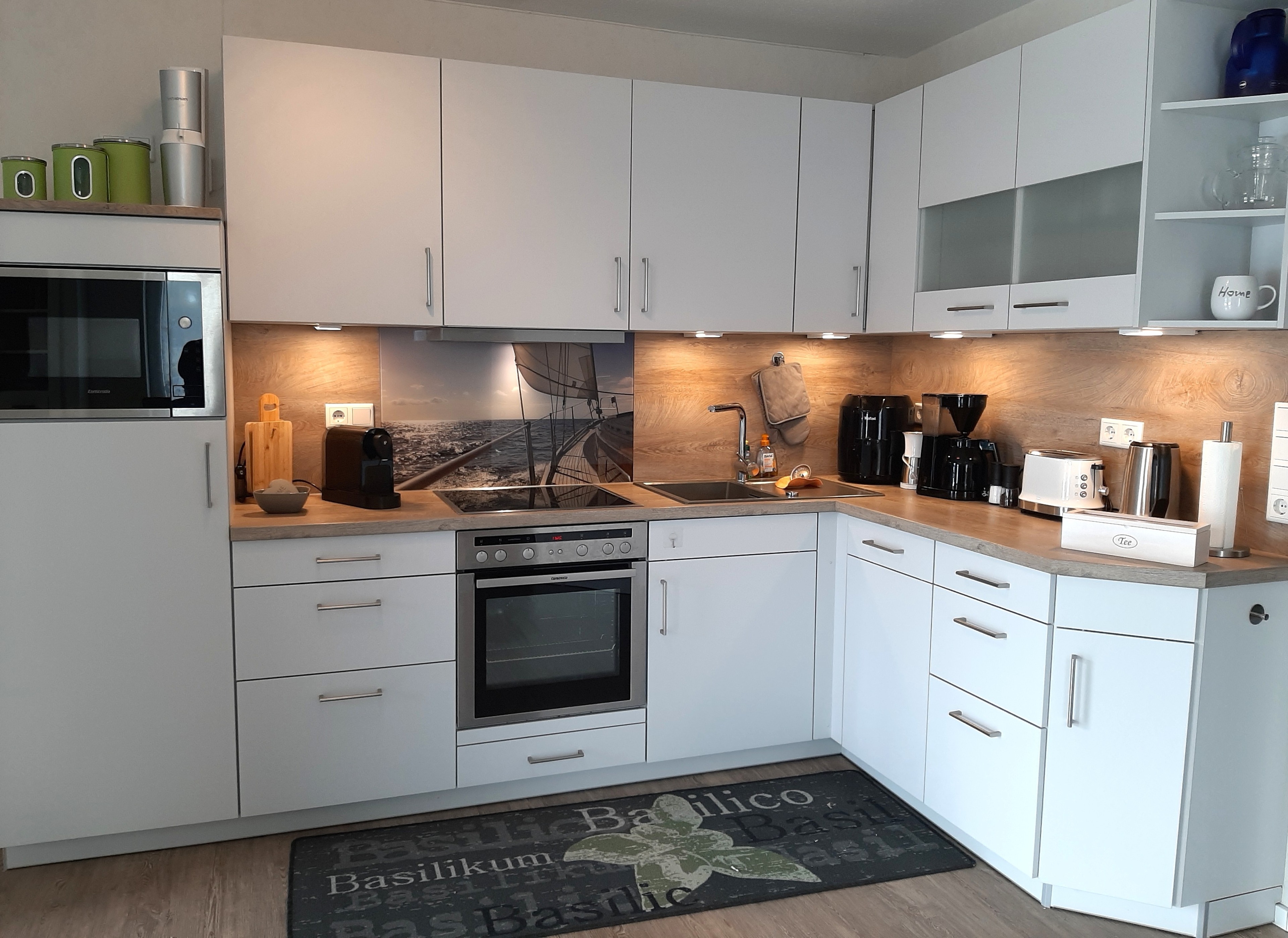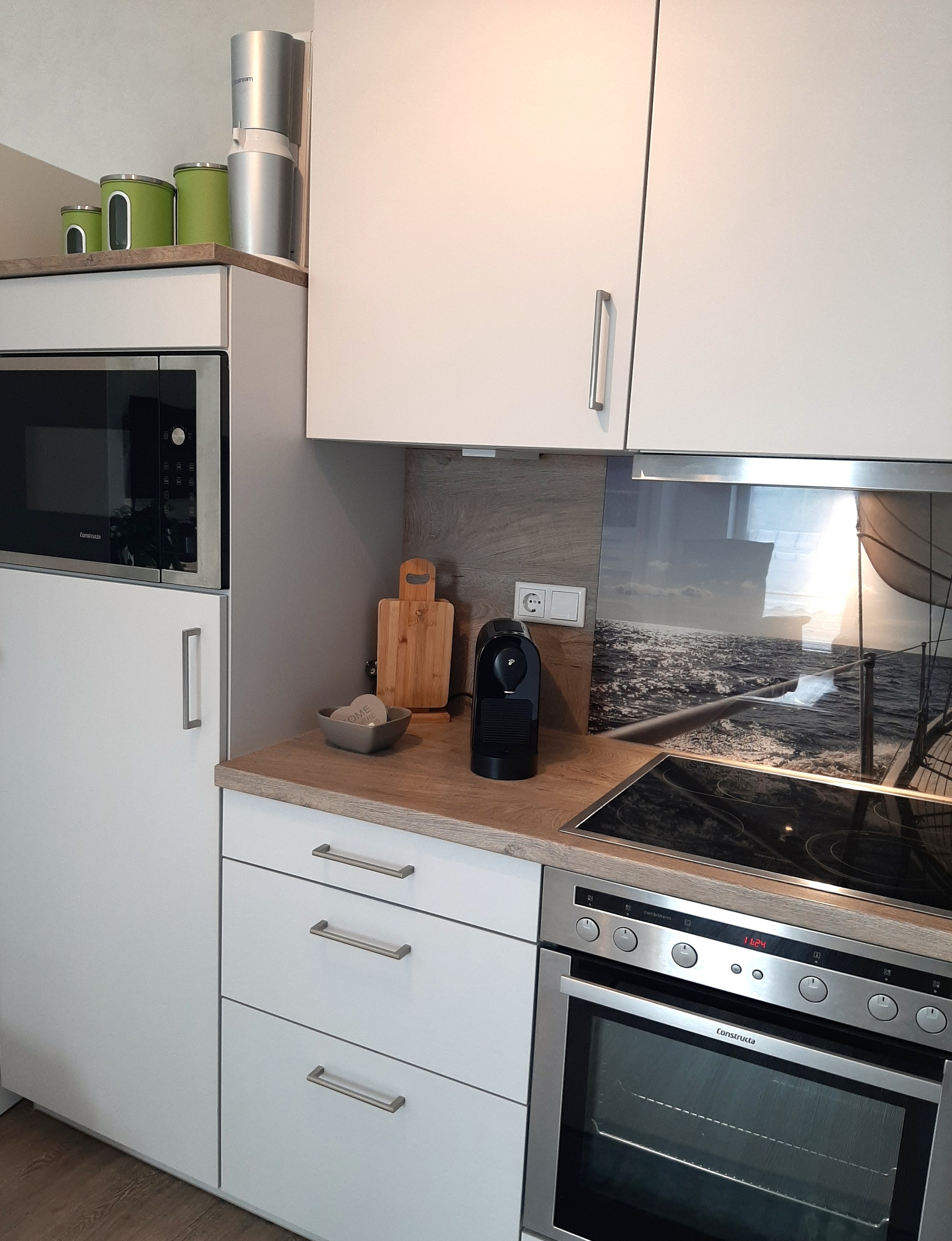 Der angrenzende Esstisch lädt zu gemeinsamen Mahlzeiten, Spieleabenden oder entspannten Gesprächen ein. Die moderne Küche ist komplett ausgestattet – mit hochwertigen Geräten wie Backofen, Cerankochfeld, Geschirrspüler, Kühlschrank mit Gefrierfach, Kaffeemaschine, Espressomaschine (Kapsel), Airfryer und allem, was Sie zum Kochen benötigen.