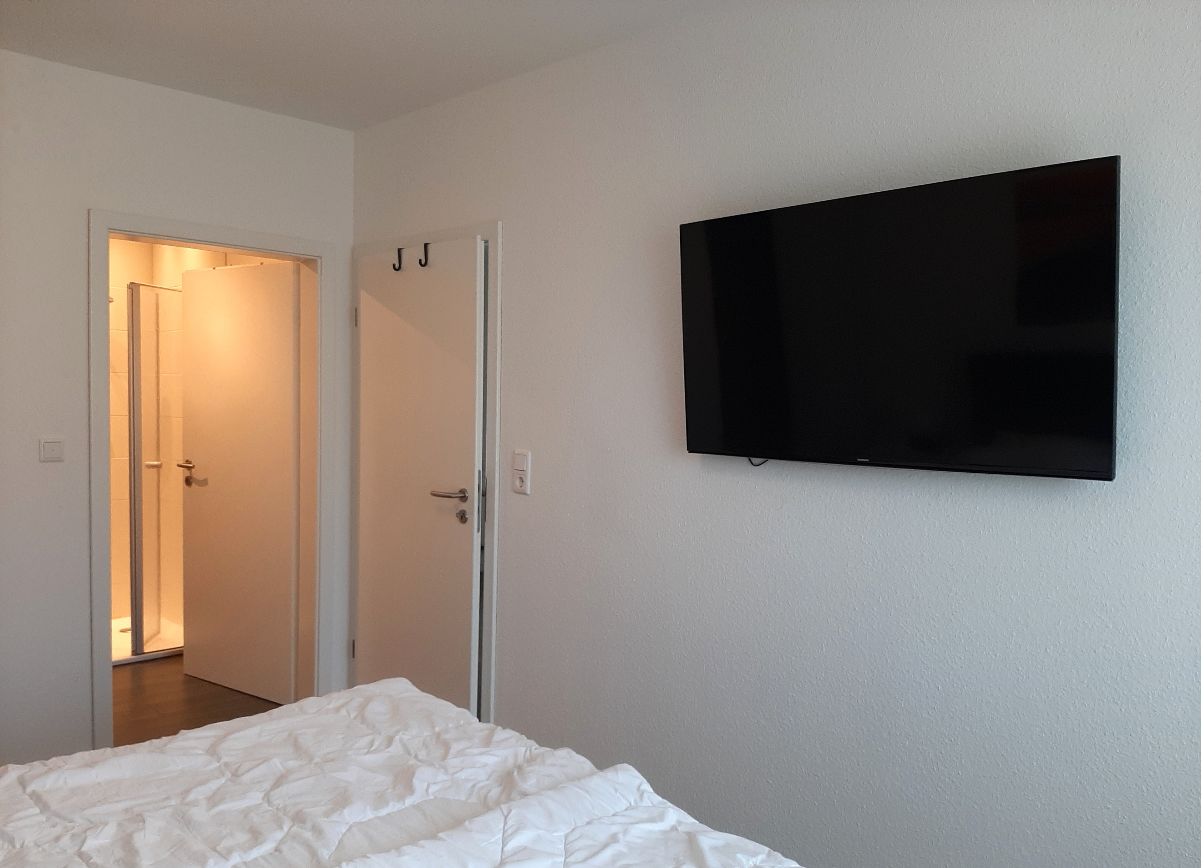Das Hauptschlafzimmer ist mit einem hochwertigen Boxspringbett ausgestattet, das maximalen Schlafkomfort bietet. Für zusätzlichen Komfort sorgt ein großer Flachbildfernseher direkt im Zimmer – ideal für entspannte Abende im Bett. Ein besonderes Highlight ist das moderne, Tageslichtbad en suite, das exklusiven Zugang zu Dusche, WC und Waschbecken bietet – ganz privat und bequem.