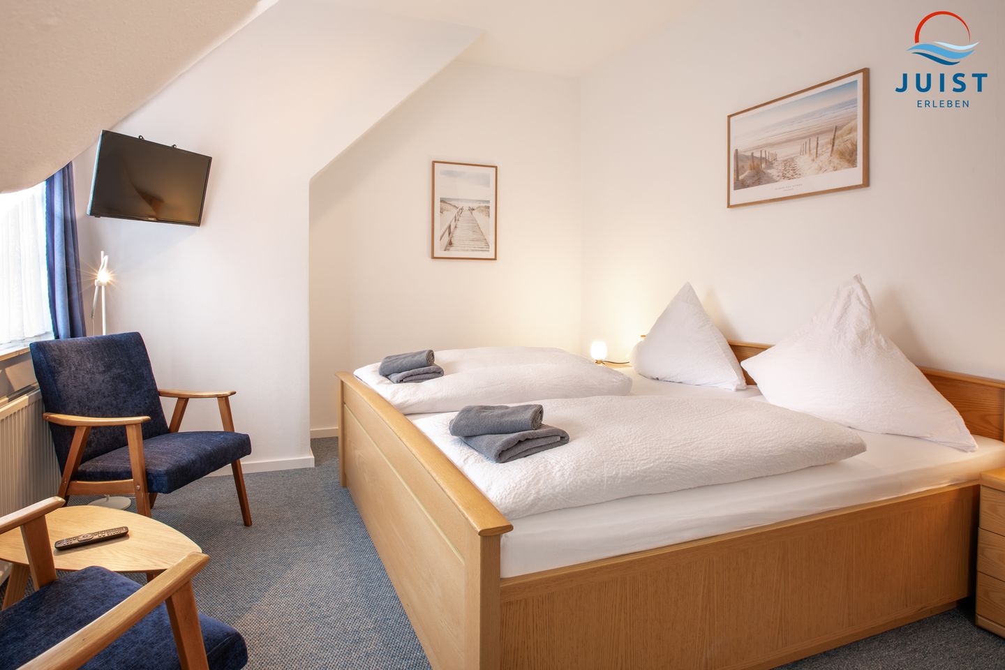 Das geschmackvoll eingerichtete Zimmer Nummer 3 verfügt über ein bequemes Bett, einen praktischen Schreibtisch, ein kleines Sofa, 2 Sessel und einen Fernseher sowie Radio für Ihre Unterhaltung. Im Badezimmer mit Dusche finden Sie alles für entspannende Momente nach einem Tag am Strand. Handtücher und Bettwäsche sind inklusive.