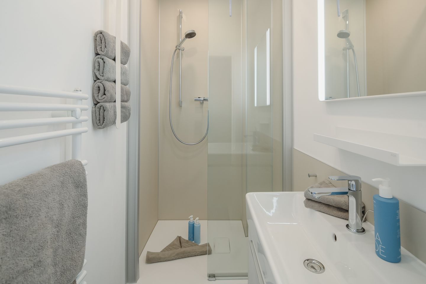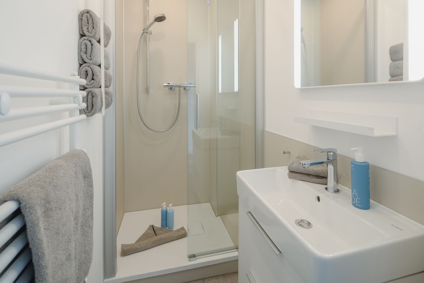 Die Wohnung beeindruckt mit einem Schlafzimmer, ausgestattet mit einem großzügigen Boxspringbett der Größe 180x200cm, das höchsten Schlafkomfort verspricht. Das Badezimmer verfügt über eine Dusche sowie ein Waschbecken, während die separate Toilette zusätzliche Privatsphäre bietet.