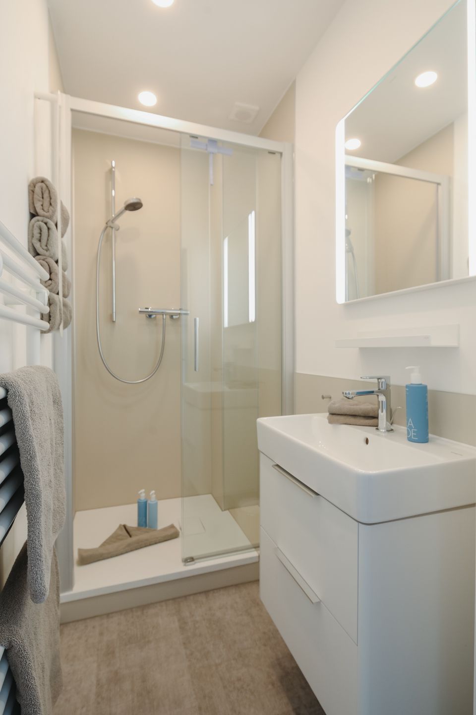 Im offenen Wohnzimmer mit integrierter Küche erwartet Sie eine voll ausgestattete Küche mit Kühlschrank, Gefrierfach, Backofen, Mikrowelle, Ceranfeld, Kaffeemaschine und einer Nespresso-Kapselmaschine. Der große Fernseher lädt zu gemütlichen Abenden ein.