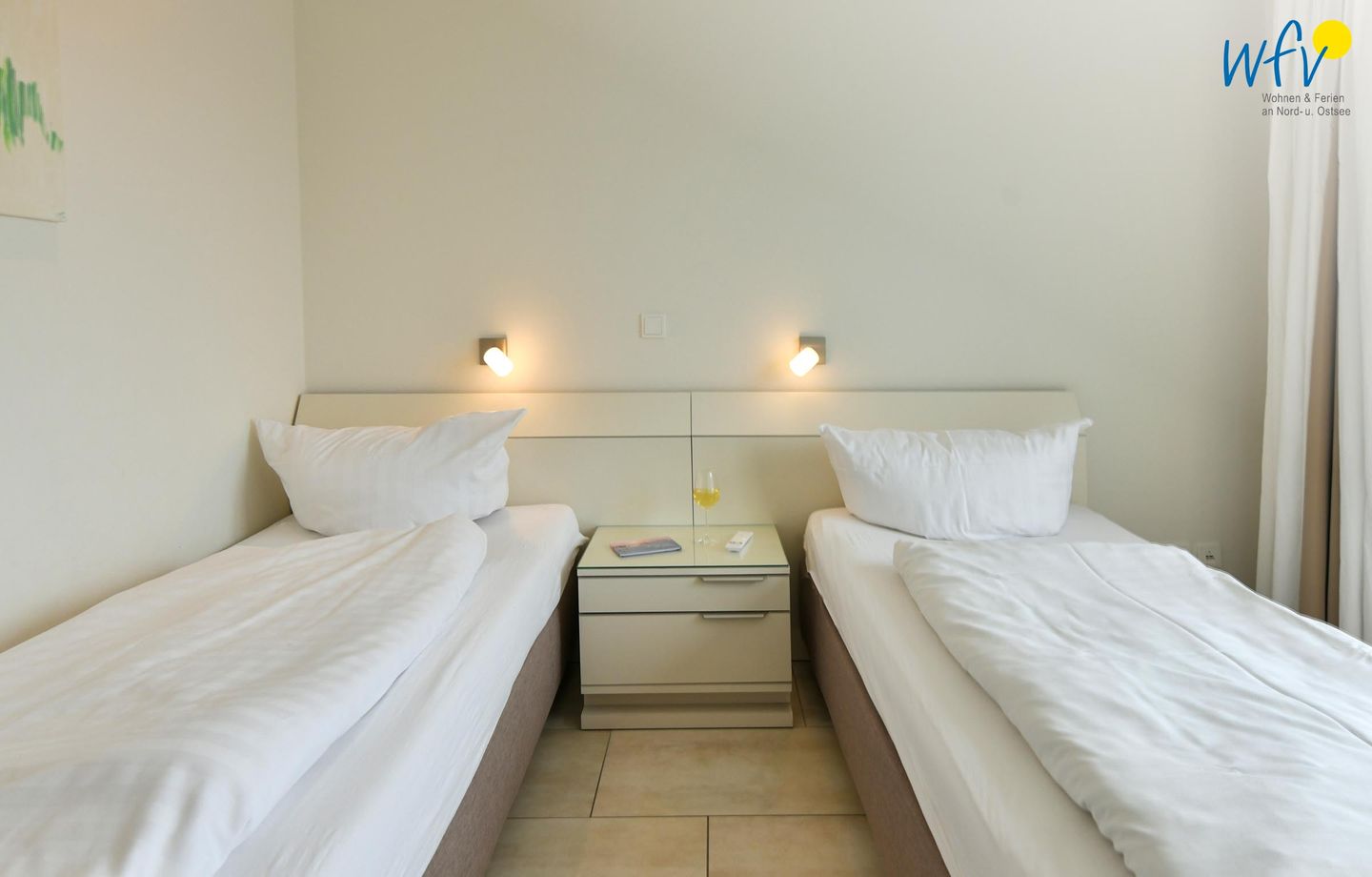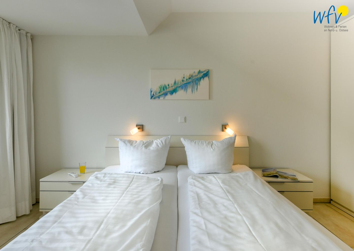 Zwei separate geschmackvoll eingerichtete Schlafzimmer mit Verdunkelungsvorhängen garantieren erholsame Nächte. Jedes Schlafzimmer bietet ausreichend Stauraum, verfügt jeweils über ein TV und wurde mit Blick auf Komfort und Stil gestaltet. In einem Zimmer befindet sich ein Doppelbett, in dem anderen stehen zwei Einzelbetten. Die Maße der Betten betragen jeweils 90 x 200 cm; die Bettdecken und Kopfkissen beinhalten Füllmaterial für Allergiker. Für die perfekte Nachtruhe sorgt die Fußbodenheizung, die auch an kühleren Tagen ein angenehmes Raumklima bietet.