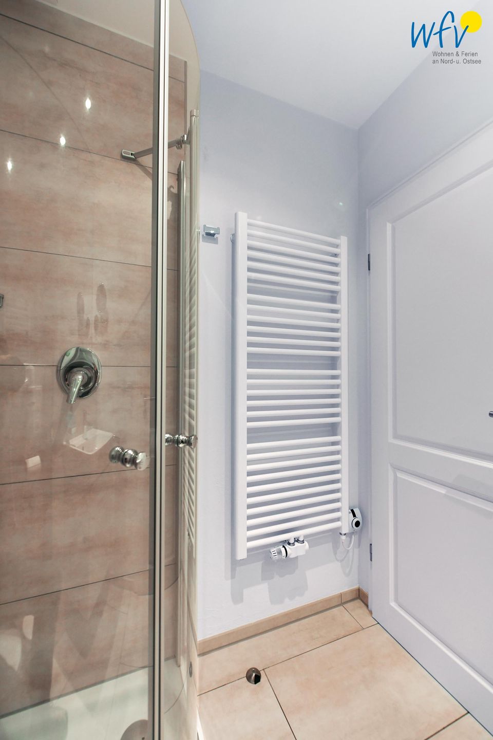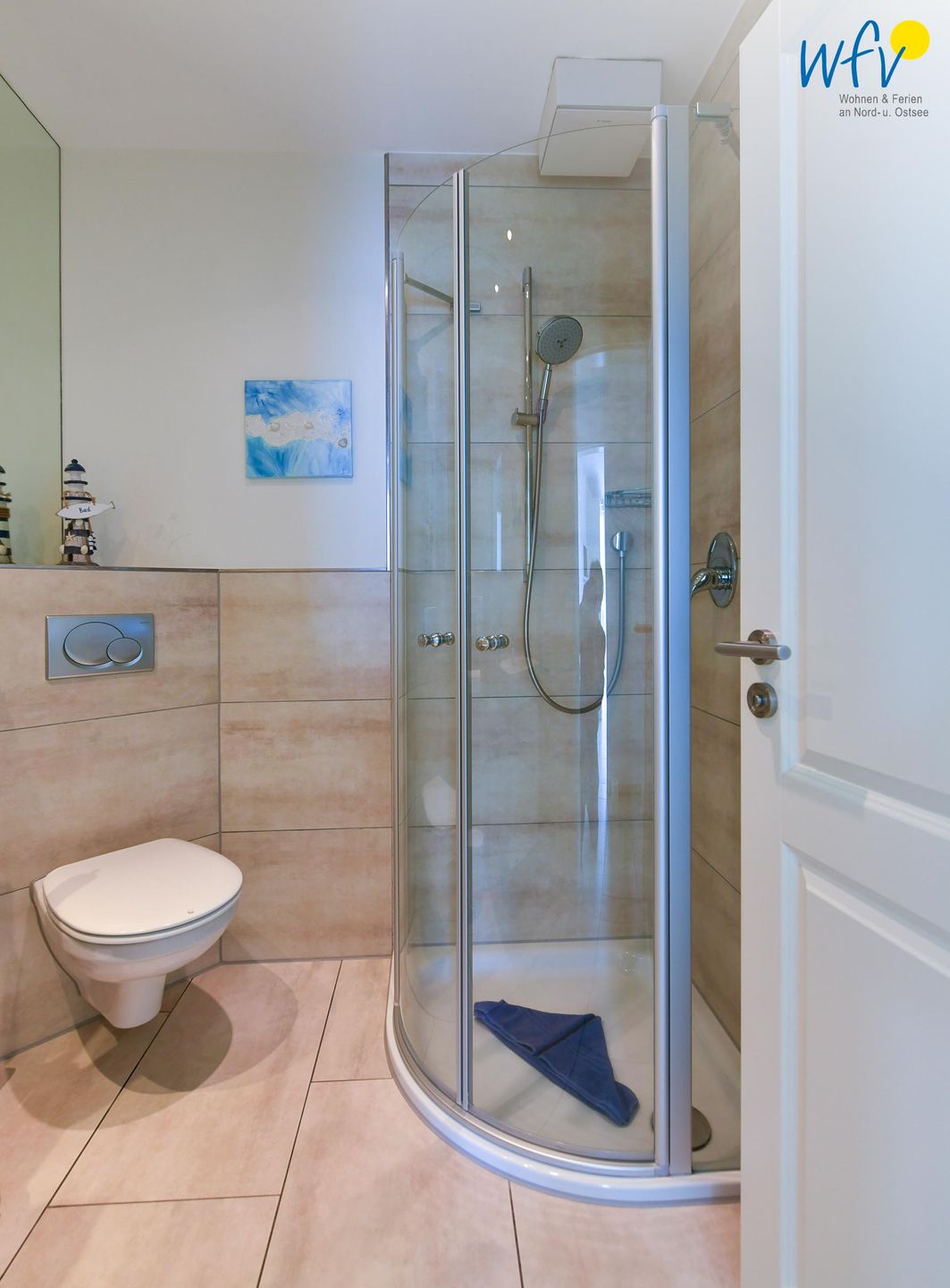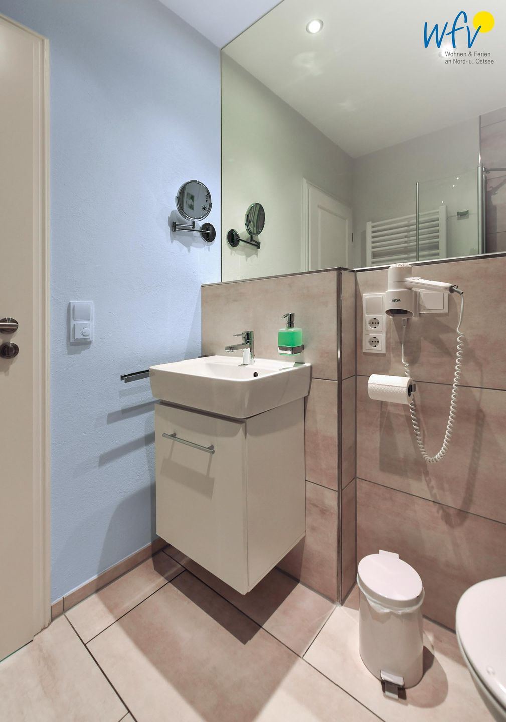 Das große Badezimmer überzeugt u.a. mit Balkonzugang, einer bodengleichen Dusche, zwei Waschbecken, einem installierten Haartrockner und einem großen Spiegel. So wird auch dieser Raum zum Wohlfühlort. Weiterer Komfort besteht durch ein zusätzliches Gäste-Bad mit Dusche, WC, Haartrockner und Spiegel.