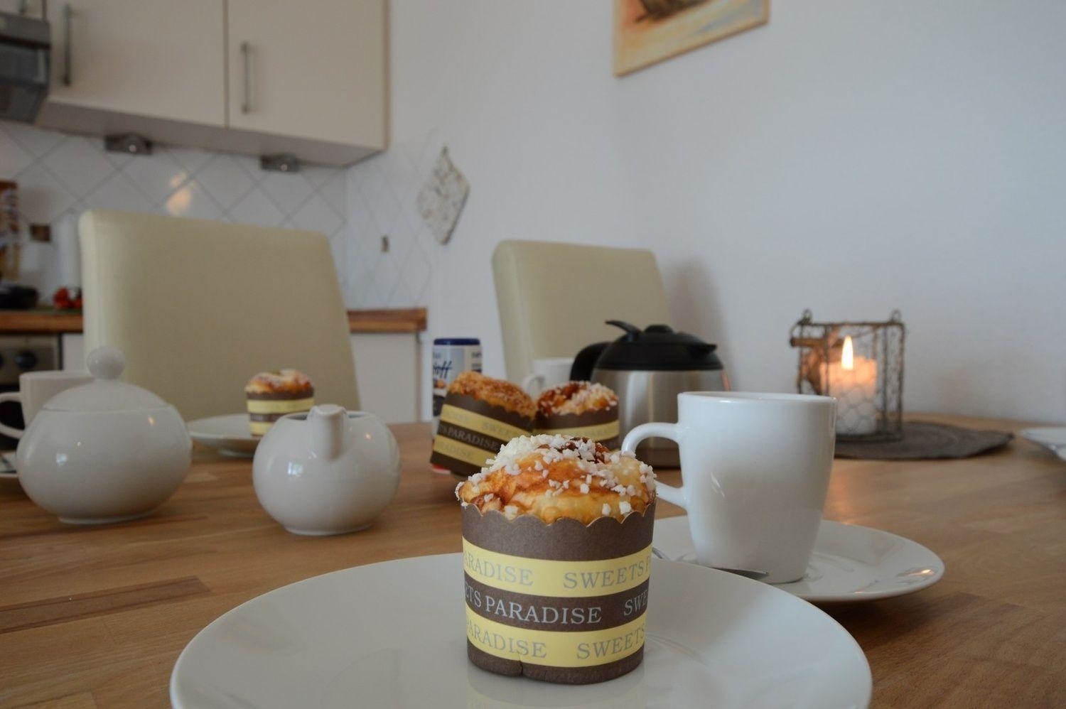 Die neue Einbauküche hat eine angenehme Arbeitshöhe. Durch die komplette Ausstattung mit Kühlschrank/und kleines Gefrierfach, Ceranfeld, Backofen, Geschirrspüler, Kaffeemaschine, Toaster, Wasserkocher, Eierkocher sowie ausreichend Koch- und Essgeschirr bietet sie viel Komfort.