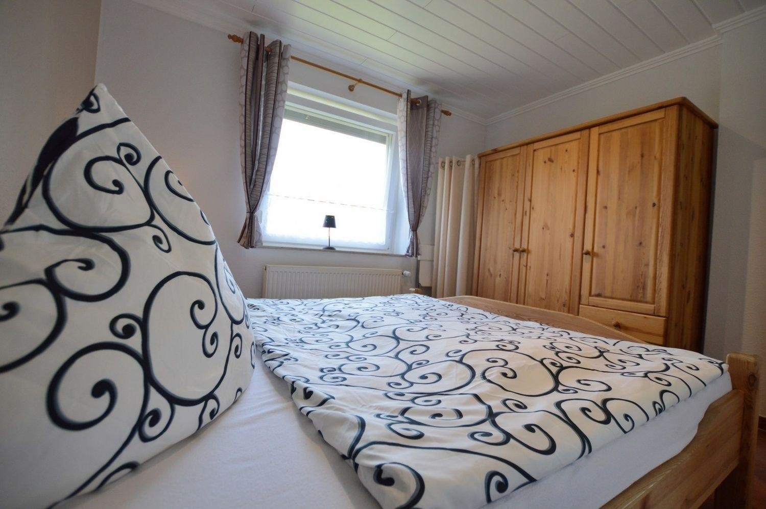 Ein Doppelbett, Kleiderschrank und Nachtkonsolen warten im Elternschlafzimmer auf Sie.