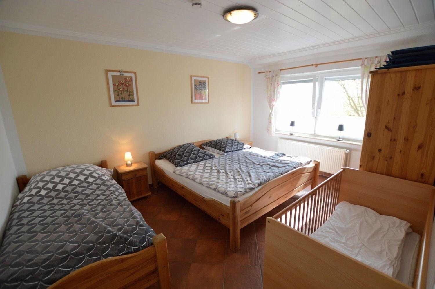 Im Kinderzimmer mit einem Einzelbett, einem Doppelbett, Kleiderschrank sowie Nachtschränken finden Ihre Kinder bestimmt den richtigen Schlafplatz.