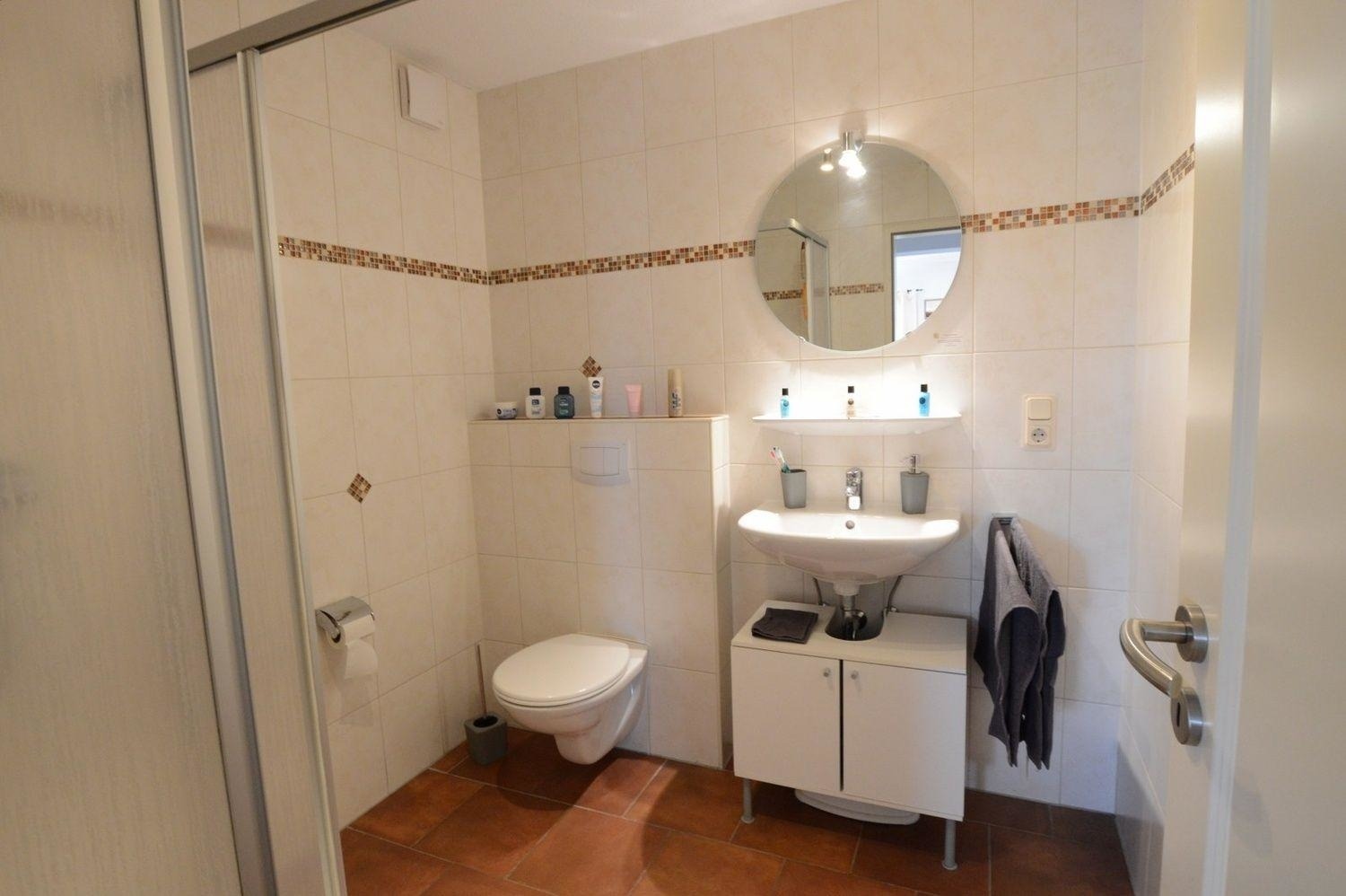 Das Badezimmer bietet Ihnen eine Dusche, WC, Waschbecken, Unterschrank, Fön und Handtuchwärmer.