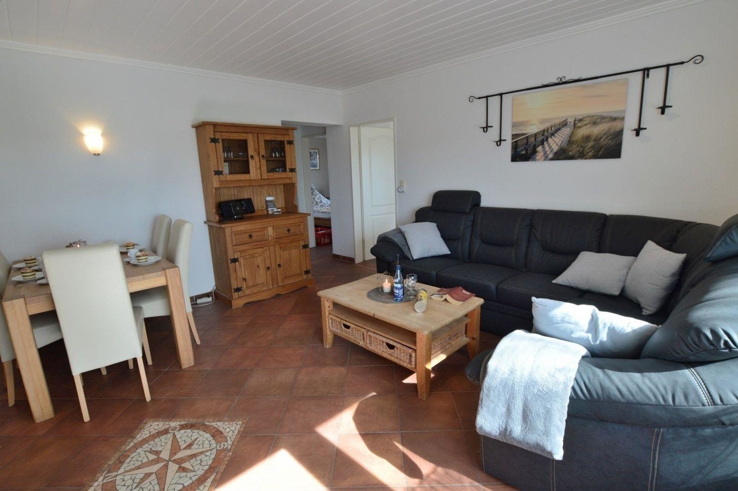Die ebenerdige und 60 qm grosse Wohnung bietet Platz für bis zu fünf Personen. Sie liegt direkt am Deich; WLAN
