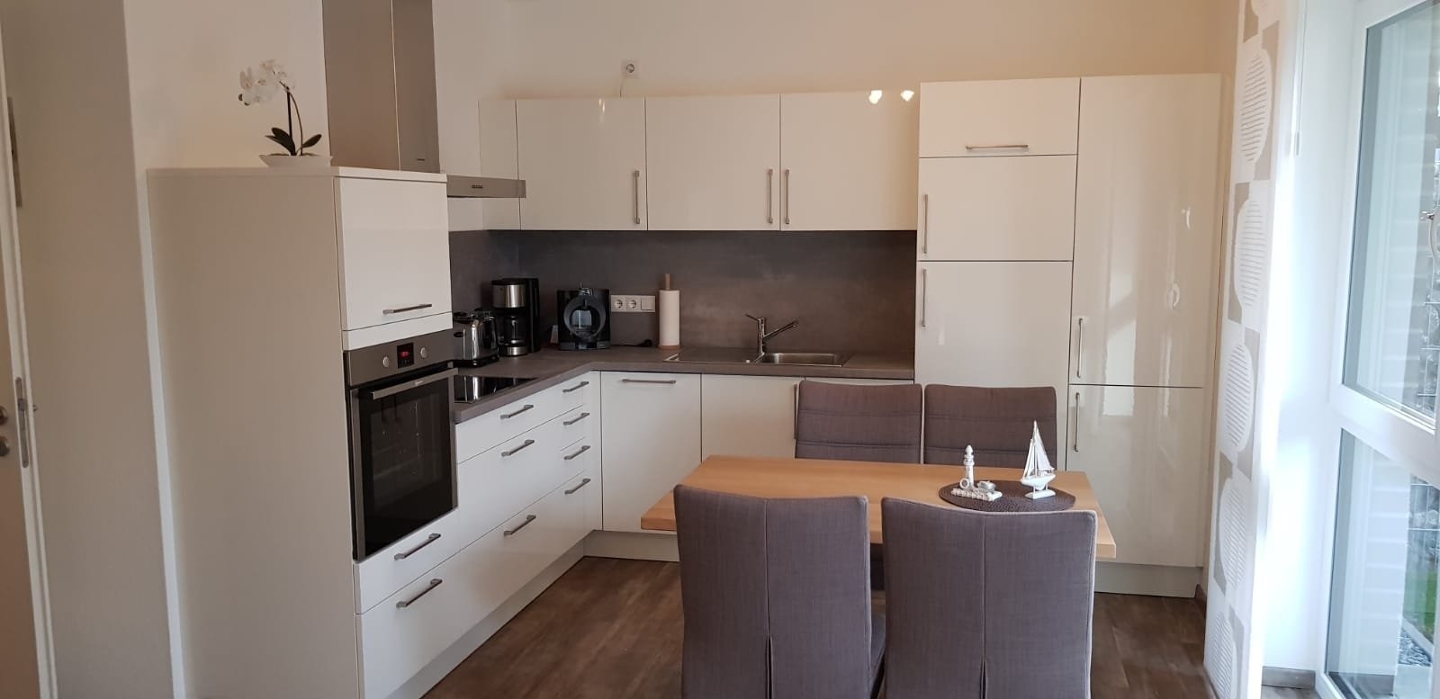 Moderne Erdgeschosswohnung in strandnaher- zentraler Lage ( Neubau 2018 ), hochwertige Ausstattung, 2 getrennte Schlafzimmer mit Flatscreen, großer Wohnraum mit Flatscreen und gemütlicher Couchecke, hochwertiger Einbauküche mit Spülmaschine, Backofen, Mikrowelle, Pad-Maschinen, Terrasse mit Gartenmöbeln, Flur, Designbad mit Regendusche, Waschmaschine, kostenloses WLAN, Aussenrollos teilweise elektrisch, PkW-Stellplatz am Haus, Fahrradabstellraum am Haus